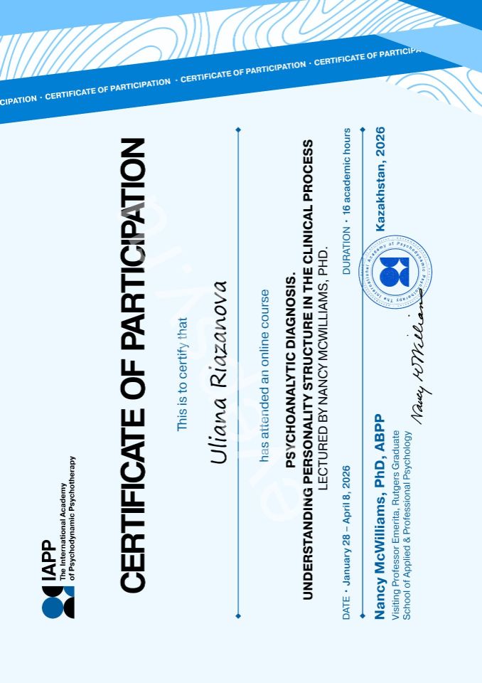 Дополнительное образование в сфере психотерапии:✓ 2019 - Психологическое сопровождение в чрезвычайных ситуациях